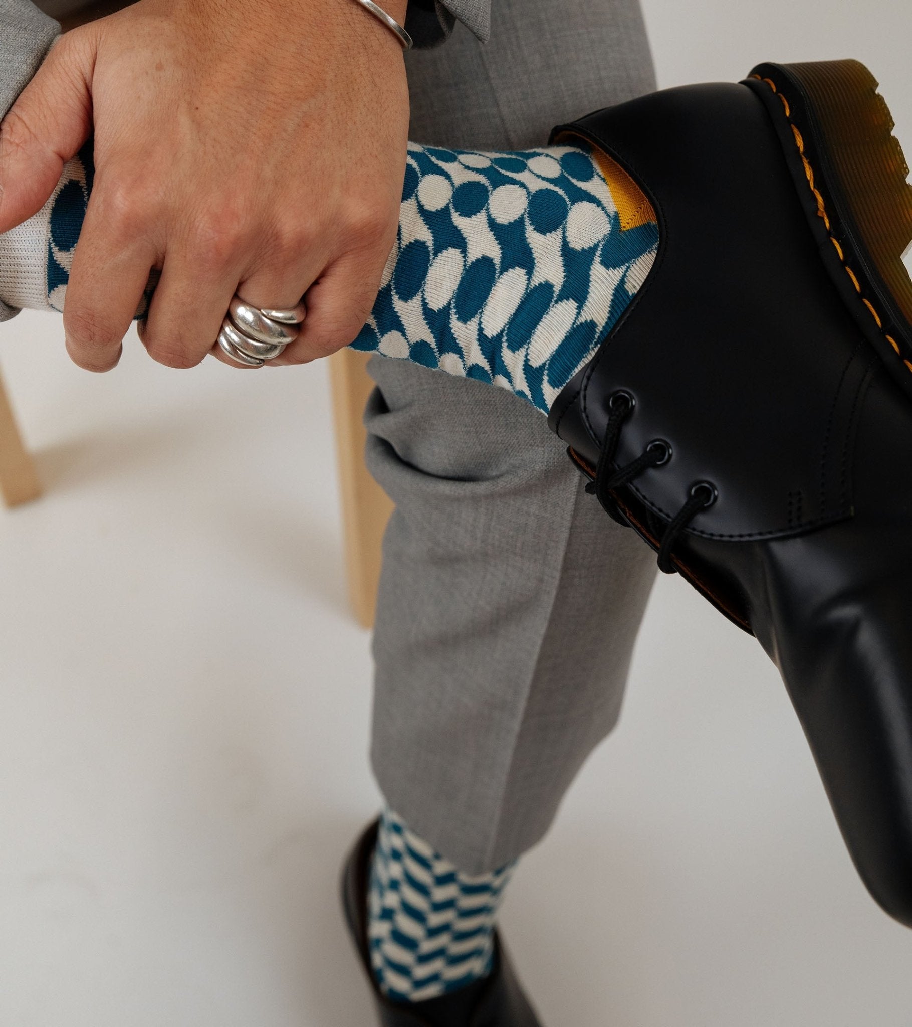 Infused with the spirit of the 60s, HOMERO SOCKS exude a unique effect with their mesmerizing petrol color pattern, making them an easy choice for your everyday wardrobe.