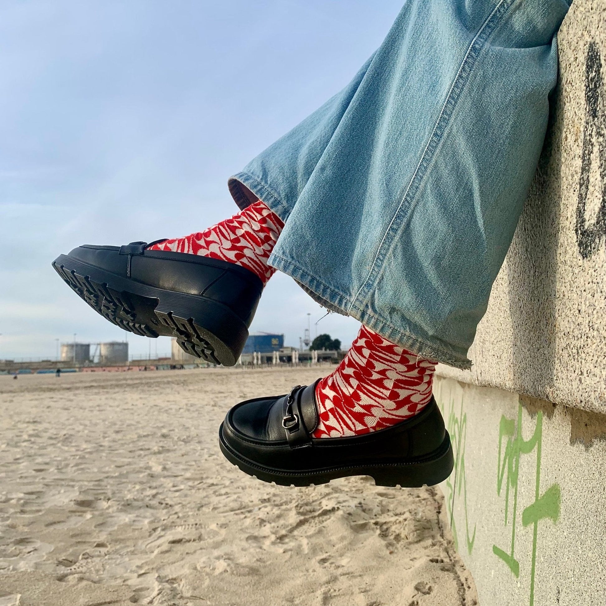 Inspired by the vibrant energy of the 60s, the HOMERO LISBON SOCKS captivate with their enchanting red pattern, providing a distinctive twist to your daily attire. Designed with the same module that originated the Homero socks' pattern, it has undergone a subtle rotation, resulting in a fresh and dynamic new design.