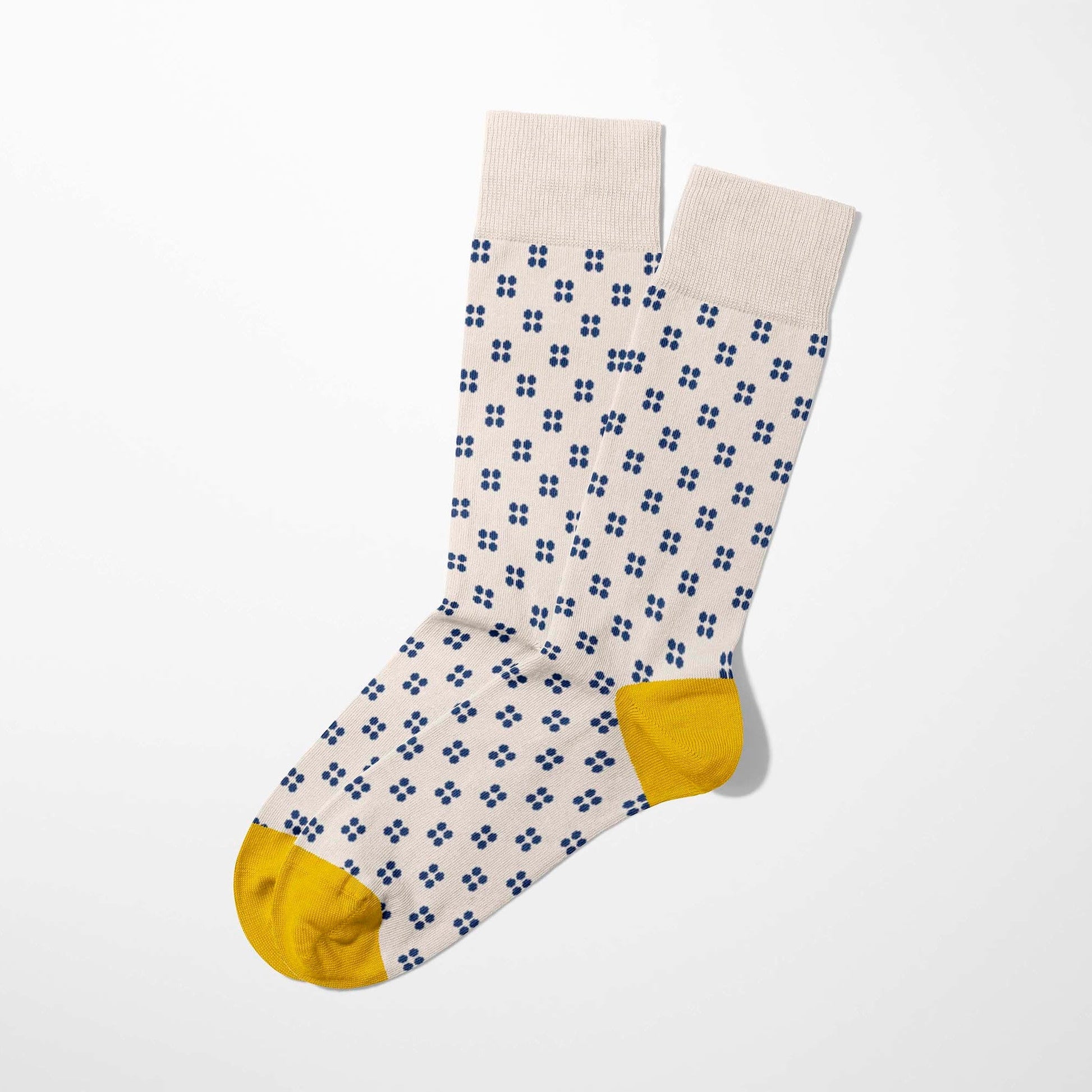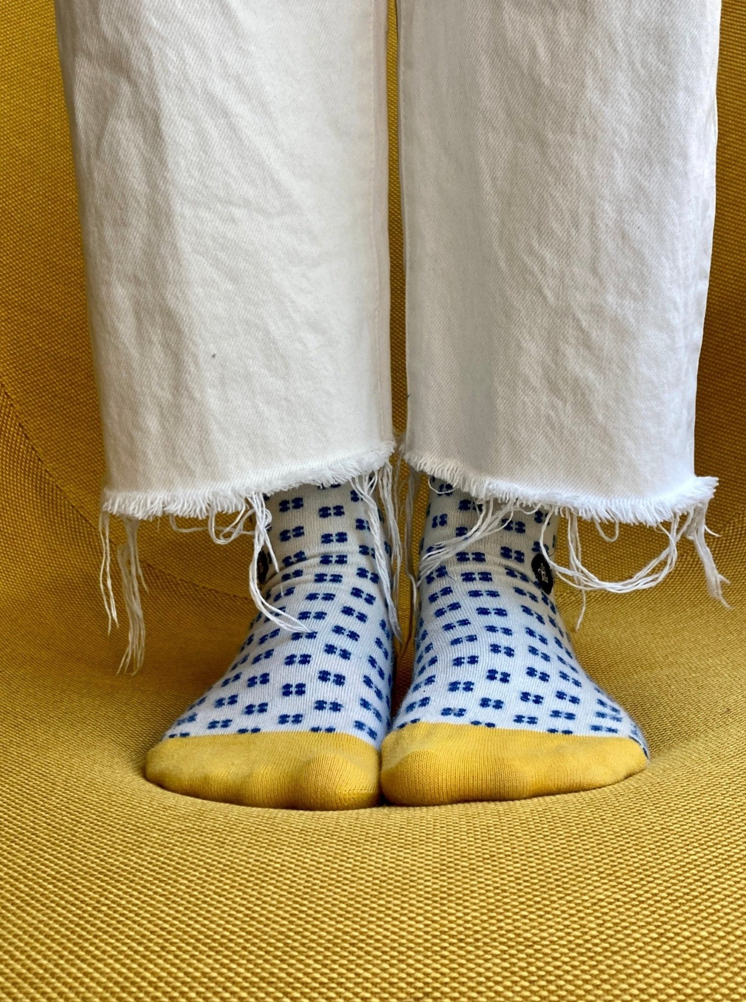 A fusion of classic elegance and contemporary style. With sets of four blue dots thoughtfully arranged along the length, these INGLESINHAS SOCKS boast a delicate design that captures the timeless charm of SirTile® collection. Step into sophistication with the classic allure of blue and the modern touch of the dot pattern.