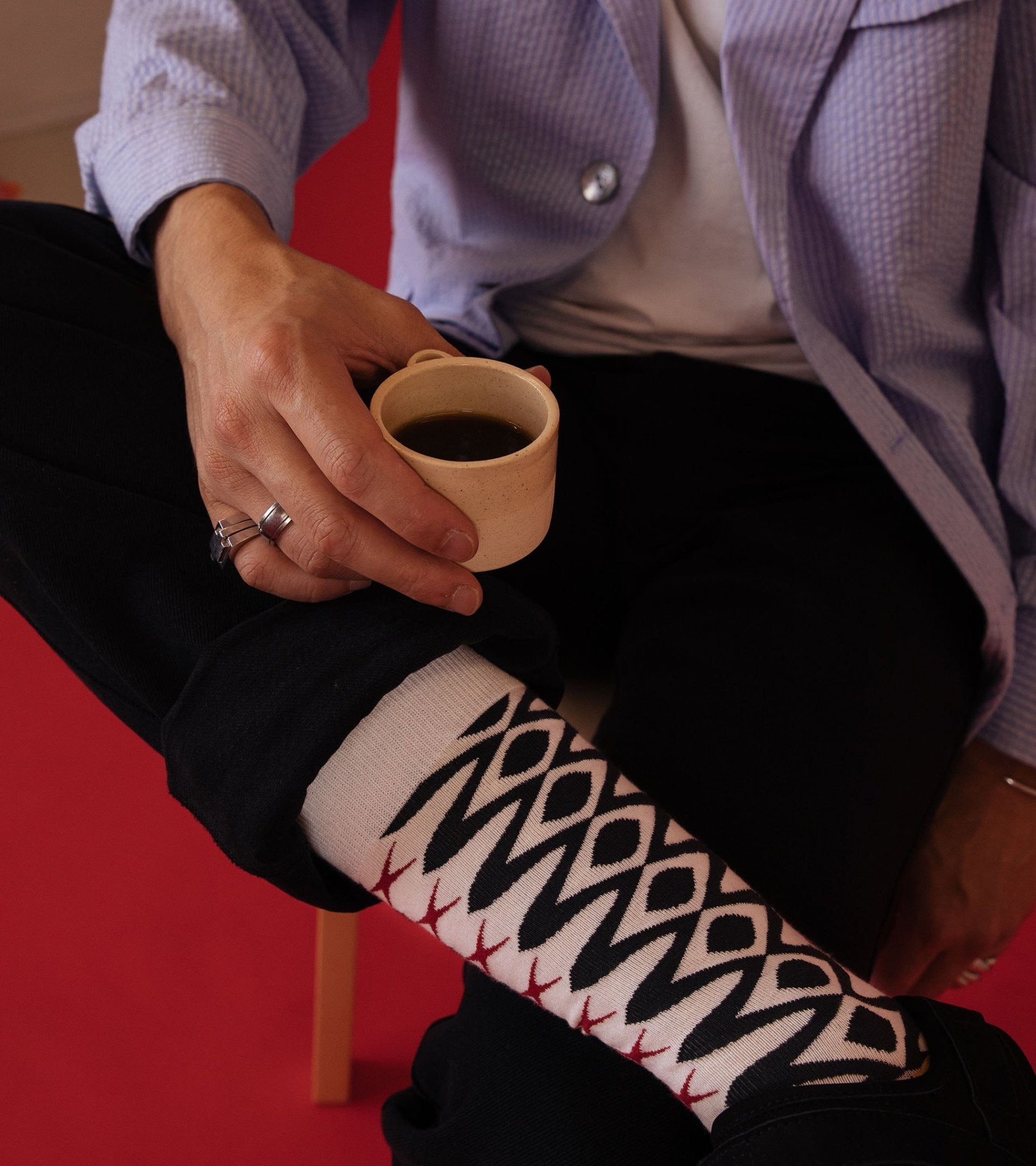 Embrace the boldness of our PEDRO HISPANO SOCKS, adorned with an eye-catching pattern in black, opening up new possibilities for trendsetters like you.