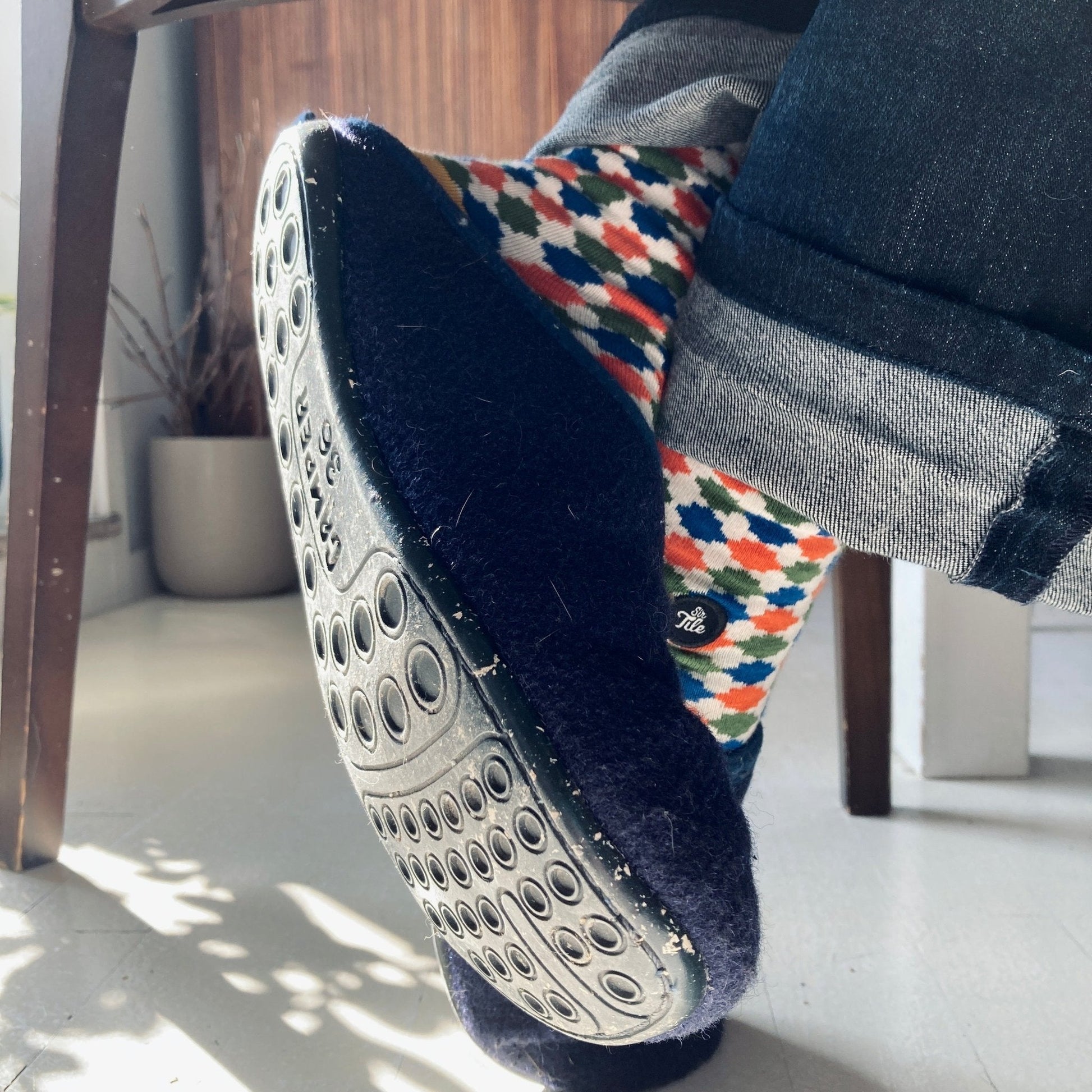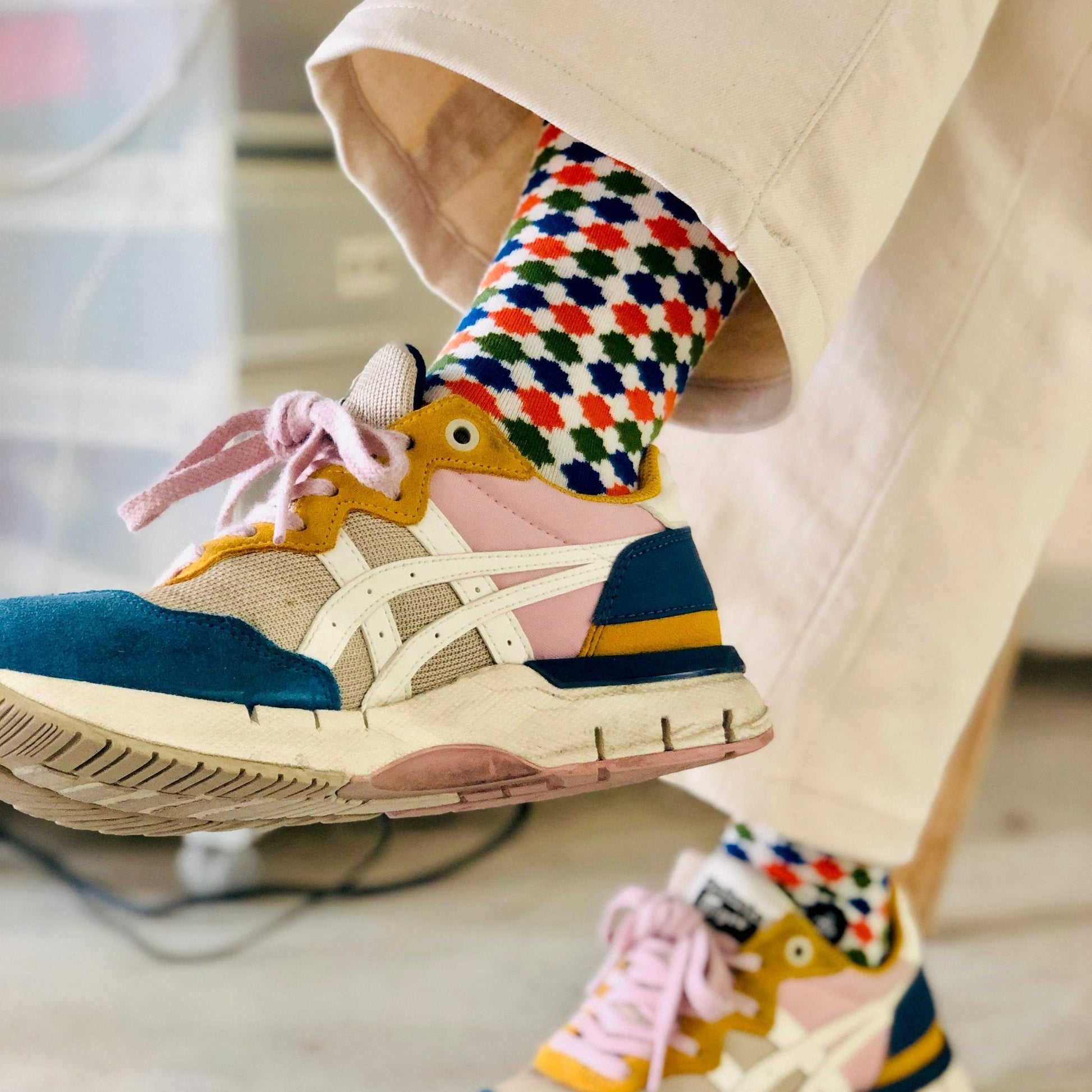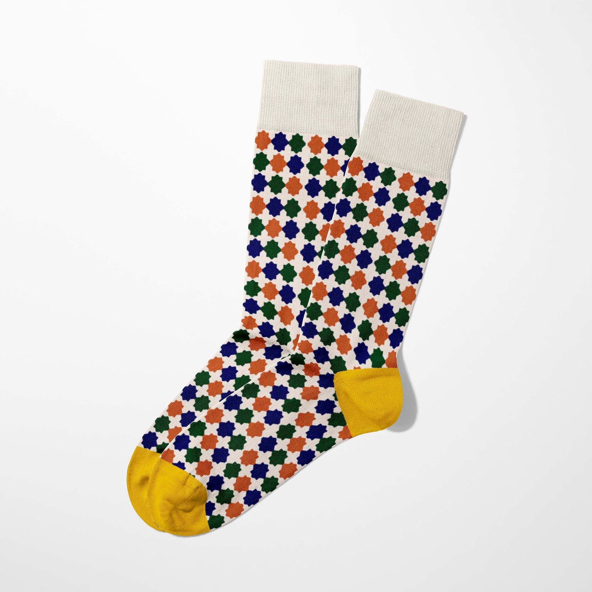 TAVIRA SOCKS elegantly represent the Arab influence in southern Portugal, celebrating their geometric design inspired by the eight-pointed star. The rich interplay of blue, green, and orange hues adds a touch of cultural elegance to your wardrobe. Whether it's a casual day or a special occasion, these colourful geometric patterns will keep your feet stylish and sophisticated.